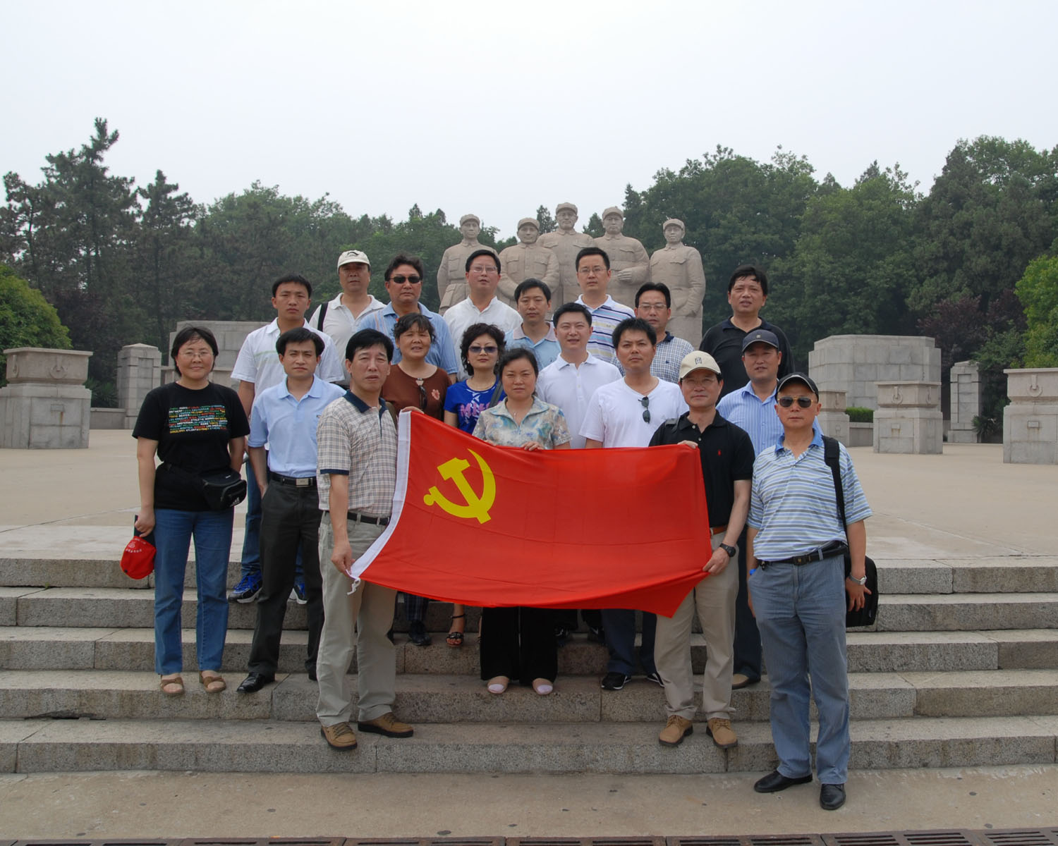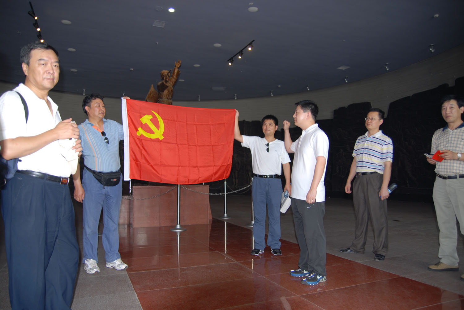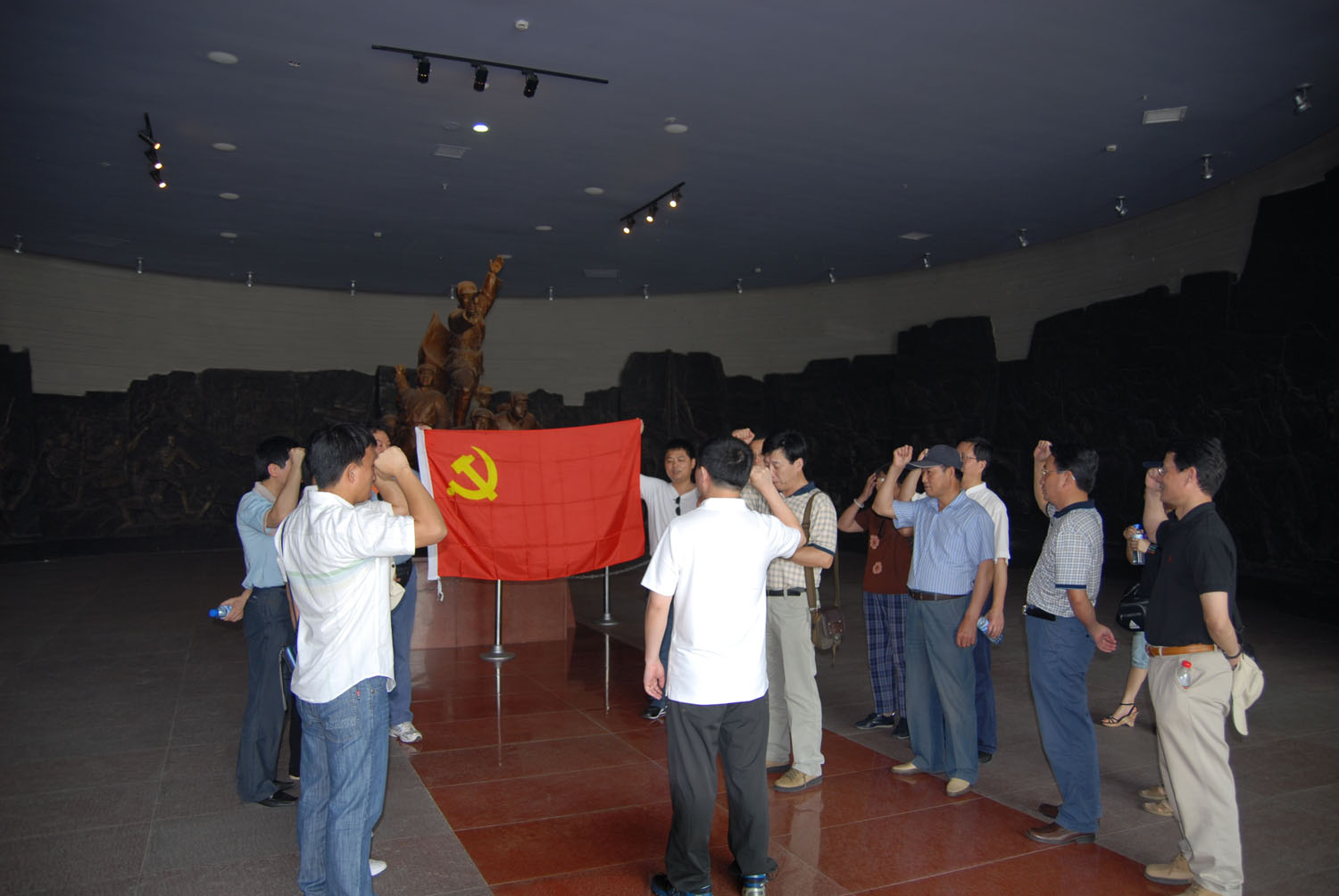 最后在淮海戰(zhàn)役紀(jì)念館前,預(yù)備黨員面隊著中國共產(chǎn)黨黨旗,緊握右拳,舉起手臂進行了莊嚴的入黨宣誓,老黨員重溫入黨誓詞。不少同志拍下了許多照片來紀(jì)念這次有意義的活動,最后全體黨員同志在淮海戰(zhàn)役紀(jì)念碑前合影以留念。