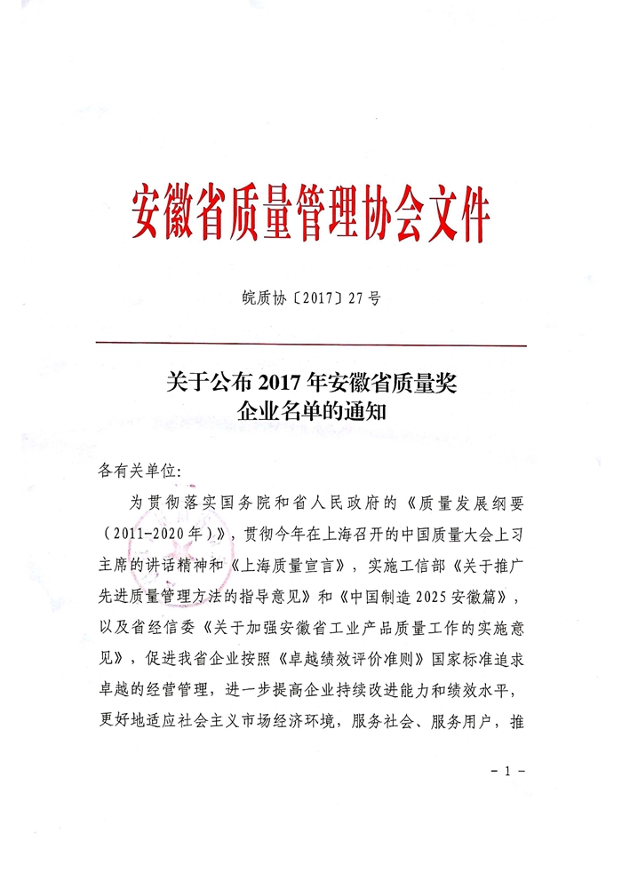 近日,“安徽省質(zhì)量獎”獲獎企業(yè)名單正式揭曉,安糧實業(yè)喜獲“2017年度安徽省質(zhì)量獎”。這是安糧實業(yè)繼榮獲"安徽名牌"、"安徽省守合同重信用企業(yè)"等榮譽后的又一省級榮譽,映射出安糧實業(yè)服務(wù)質(zhì)量、產(chǎn)品質(zhì)量的穩(wěn)定以及強大的企業(yè)綜合實力?!?/span>