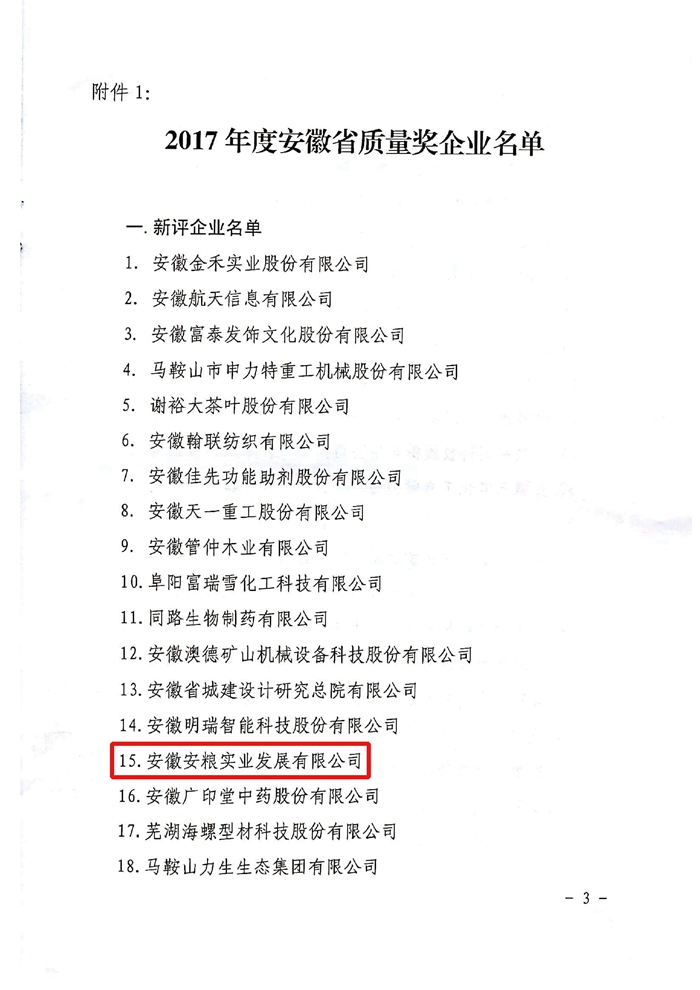 熱烈祝賀安糧實業(yè)榮獲“2017年度安徽省質(zhì)量獎”