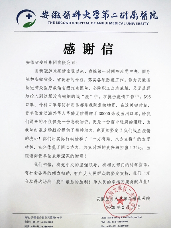 捐贈儀式上,安醫(yī)大二附院黨委副書記高長林親自將感謝信交到安糧實(shí)業(yè)黨支部書記、董事長吳國杰手中,正如安醫(yī)大二附院的感謝信中所寫“這不僅僅是一份急缺物資,更是一份雪中送炭的溫暖”,作為安徽省內(nèi)大型的專業(yè)進(jìn)出口貿(mào)易企業(yè),安糧實(shí)業(yè)為疫情防控做力所能及的事情是榮幸,更是一種責(zé)任,相信眾志成城,共克時艱,這場疫情阻擊戰(zhàn)就一定能夠打贏!