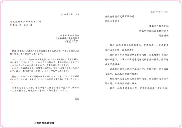 日本水產(chǎn)株式會(huì)社向安糧實(shí)業(yè)寄來(lái)捐贈(zèng)口罩感謝信