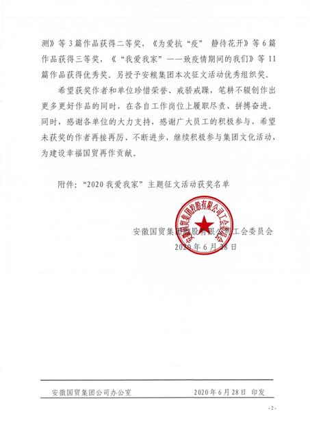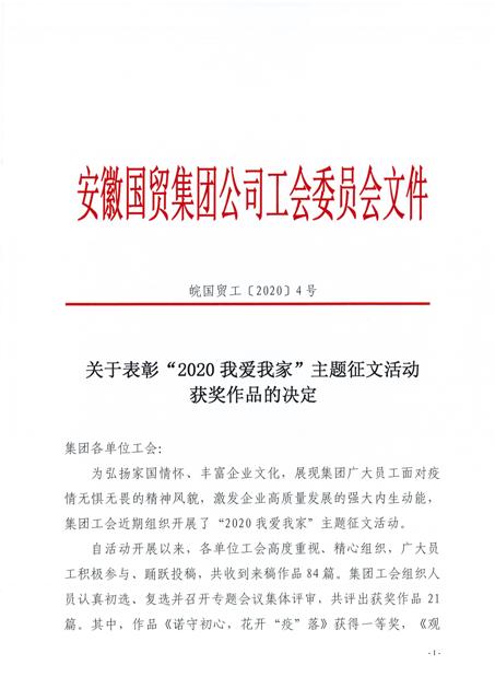 為弘揚家國情懷、豐富企業(yè)文化,國貿(mào)集團工會組織開展了“2020我愛我家”主題征文活動。安糧集團工會積極參與,最終斬獲多項獎項,以最佳的姿態(tài)畫上圓滿的句號。