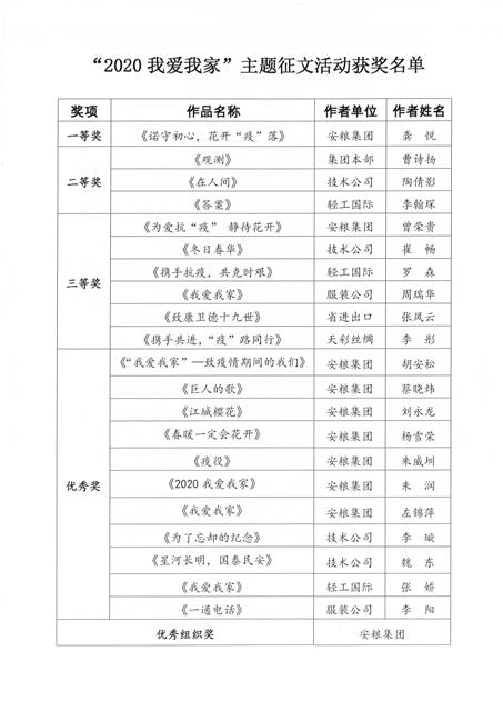 安糧集團工會自接到通知后,組織各分工會、工會小組積極動員員工,踴躍投稿,共征得稿件42篇,占國貿(mào)集團總投稿數(shù)84篇的一半。最終,安糧期貨龔悅的《諾守初心,花開“疫”落》和安糧實業(yè)曾榮貴的《為愛抗“疫” 靜待花開》分別榮獲一等獎和三等獎,安糧控股蔡曉煒的《巨人的歌》等7篇作品榮獲優(yōu)秀獎。安糧集團因高度重視、精心組織,特別榮獲優(yōu)秀組織獎。