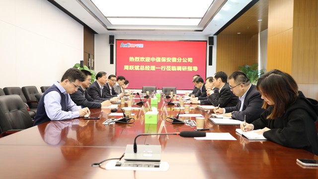 3月3日下午,中信保安徽分公司黨委書記、總經(jīng)理周躍斌帶隊來公司調(diào)研,曹訓(xùn)立董事長熱情接待了周躍斌總經(jīng)理一行并舉行調(diào)研座談,周洪、吳國杰、朱亮及相關(guān)部門負(fù)責(zé)人參加座談會。