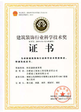 自2019年評(píng)選以來(lái),公司申報(bào)的“安徽(中國(guó))桐城文化博物館”項(xiàng)目斬獲科技創(chuàng)新工程獎(jiǎng)一項(xiàng),總結(jié)形成的施工技術(shù)成果“不規(guī)則立面齒條型GRC幕墻施工技術(shù)”獲得科技創(chuàng)新成果獎(jiǎng)一項(xiàng),走在安徽省內(nèi)裝飾行業(yè)的前沿。之后相繼獲得兩項(xiàng)科技創(chuàng)新工程獎(jiǎng):合肥市第六十八中學(xué)改擴(kuò)建項(xiàng)目-綜合樓工程,六安市兒童醫(yī)院、金安區(qū)婦幼保健院醫(yī)療病房綜合樓裝飾裝修工程;兩項(xiàng)科技創(chuàng)新成果獎(jiǎng):“一種可開啟180度的裝飾消火栓暗門”,“ 基于3D建模技術(shù)高支模結(jié)構(gòu)與裝飾結(jié)構(gòu)共用盤扣腳手架安裝技術(shù)”。其中“一種可開啟180度的裝飾消火栓暗門”科技創(chuàng)新成果更是獲得一等獎(jiǎng)的好成績(jī)。