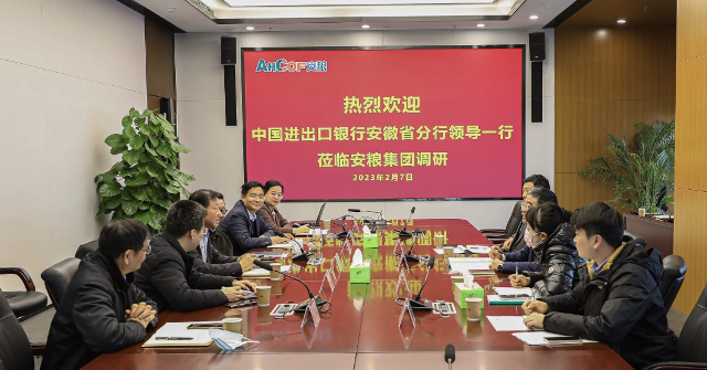 2023年2月7日,中國進(jìn)出口銀行安徽省分行武建軍行長、王宇輝副行長等一行到公司調(diào)研。安糧集團(tuán)、安糧控股公司領(lǐng)導(dǎo)曹訓(xùn)立、周洪、楊榮山、程松林及相關(guān)部室負(fù)責(zé)人熱情接待了武行長一行并舉行座談。