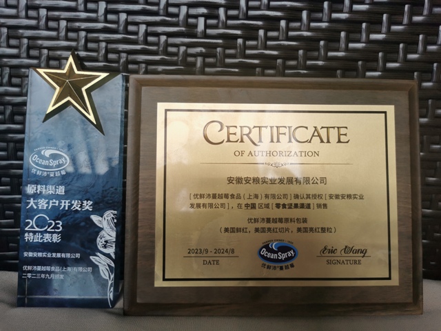 安糧實(shí)業(yè)獲得優(yōu)鮮沛品牌授權(quán),并榮獲“大客戶開發(fā)獎(jiǎng)”,不僅是對(duì)安糧實(shí)業(yè)在休閑食品原料領(lǐng)域?qū)I(yè)性的認(rèn)可,也是對(duì)我司市場(chǎng)開拓能力的信任。通過共享資源、互換優(yōu)勢(shì),安糧實(shí)業(yè)與優(yōu)鮮沛將共同推動(dòng)休閑食品行業(yè)的發(fā)展,為廣大消費(fèi)者帶來更多美味、健康的休閑食品,未來安糧實(shí)業(yè)與優(yōu)鮮沛的合作會(huì)讓更多客戶采購到高品質(zhì)休閑食品原料和新鮮蔓越莓產(chǎn)品。